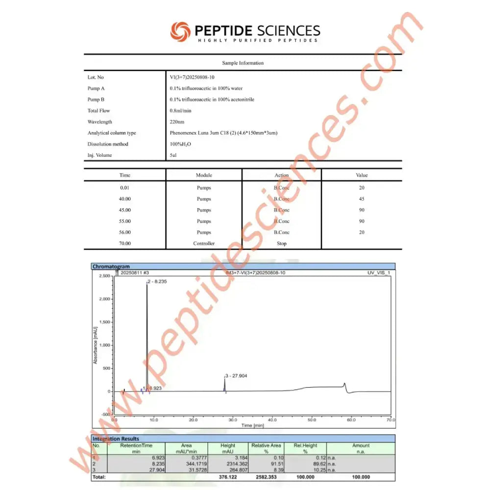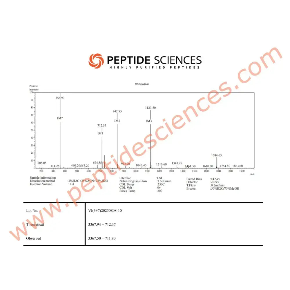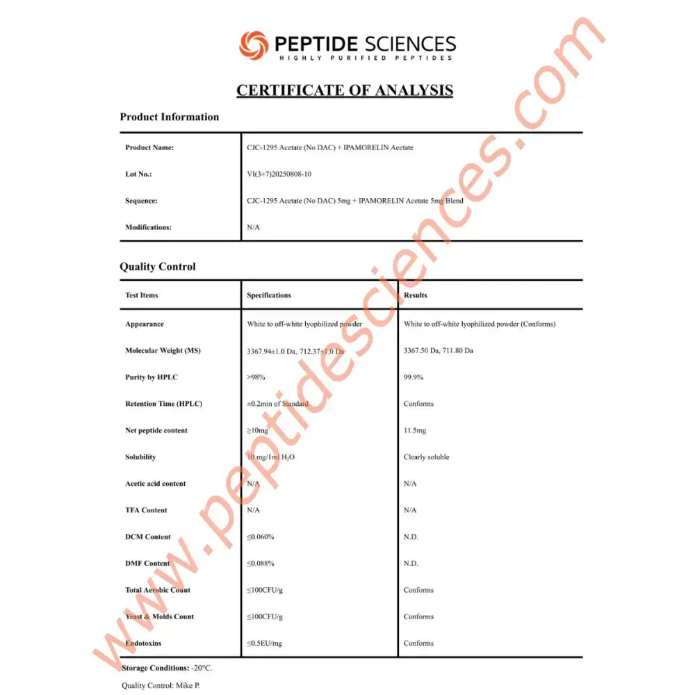 CJC-1295 (como DAC) e Ipamorelin é uma mistura de peptídeos para pesquisa que combina dois secretagogos mecanisticamente distintos que atuam sinergicamente no eixo do hormônio do crescimento. O CJC-1295 (Mod GRF 1–29) tem como alvo os receptores de GHRH, estimulando a síntese de GH mediada por cAMP/PKA, enquanto o Ipamorelin se liga ao receptor de grelina (GHS-R1a), ativando as vias de sinalização de cálcio acopladas a Gq/11. Juntos, eles servem como um modelo para o estudo da pulsatilidade do GH induzida por peptídeos, da interação entre receptores e da regulação hipotalâmico-hipofisária em sistemas experimentais controlados.