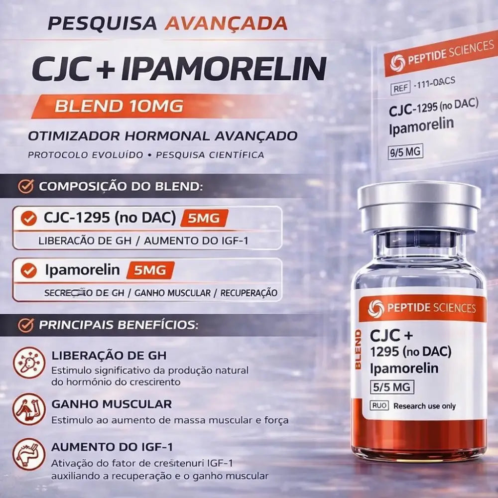 Este produto é uma mistura de peptídeos formulada em laboratório, composta por CJC-1295 (sem DAC; GRF modificado (1–29)) e Ipamorelin. A mistura é fornecida exclusivamente para uso em pesquisa, com o objetivo de apoiar a investigação mecanística da sinalização do eixo do hormônio do crescimento por meio da ativação coordenada de GHRHR e GHSR-1a em sistemas experimentais pré-clínicos.