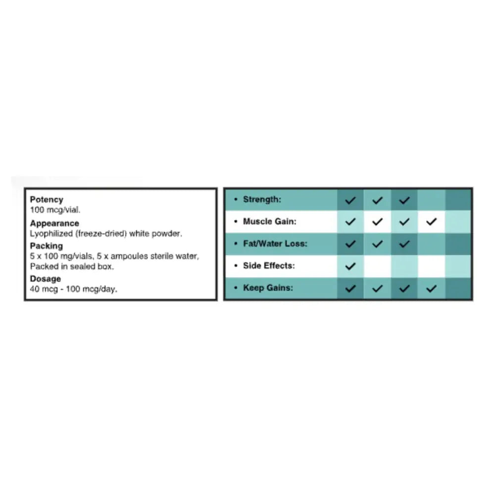 Cada kit contém 5 frascos de 100mcg, oferecendo praticidade e controle preciso para protocolos avançados utilizados por atletas, praticantes de musculação e entusiastas da performance física.