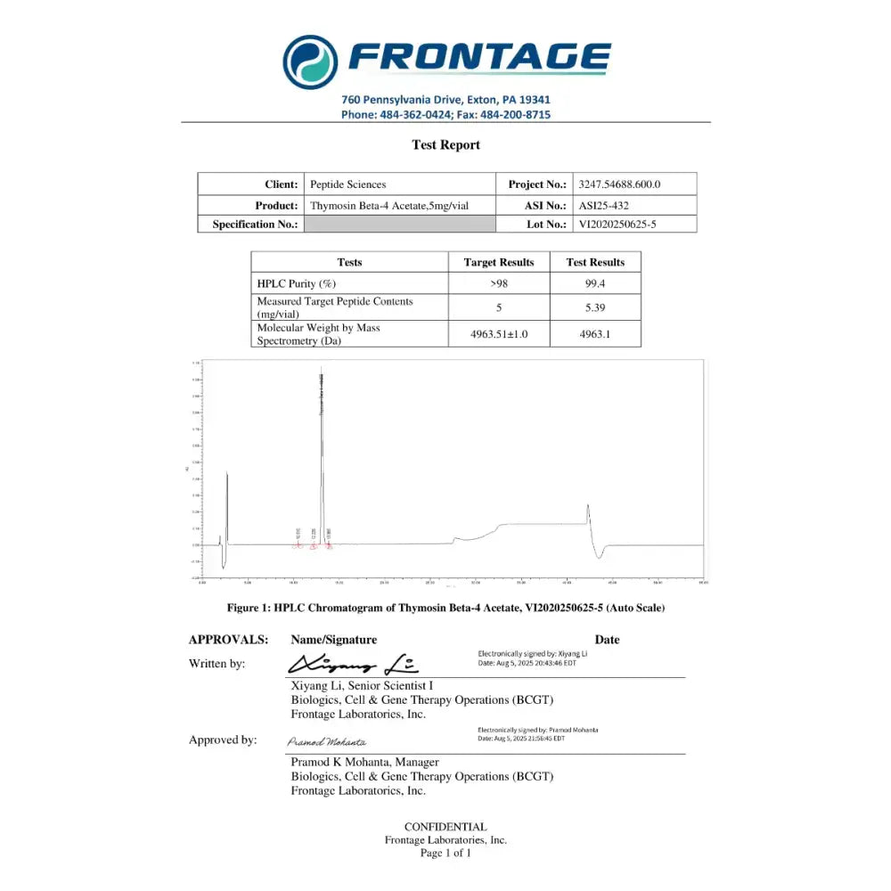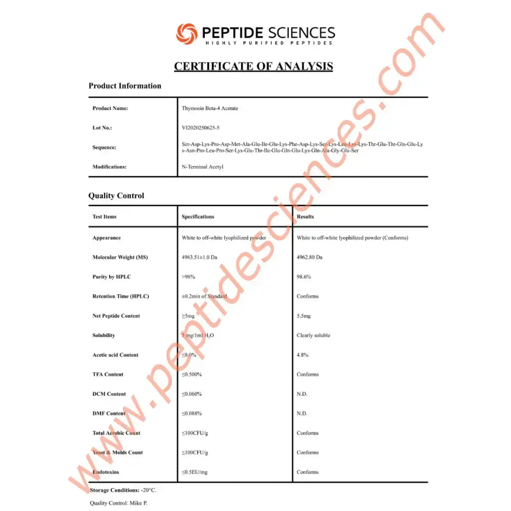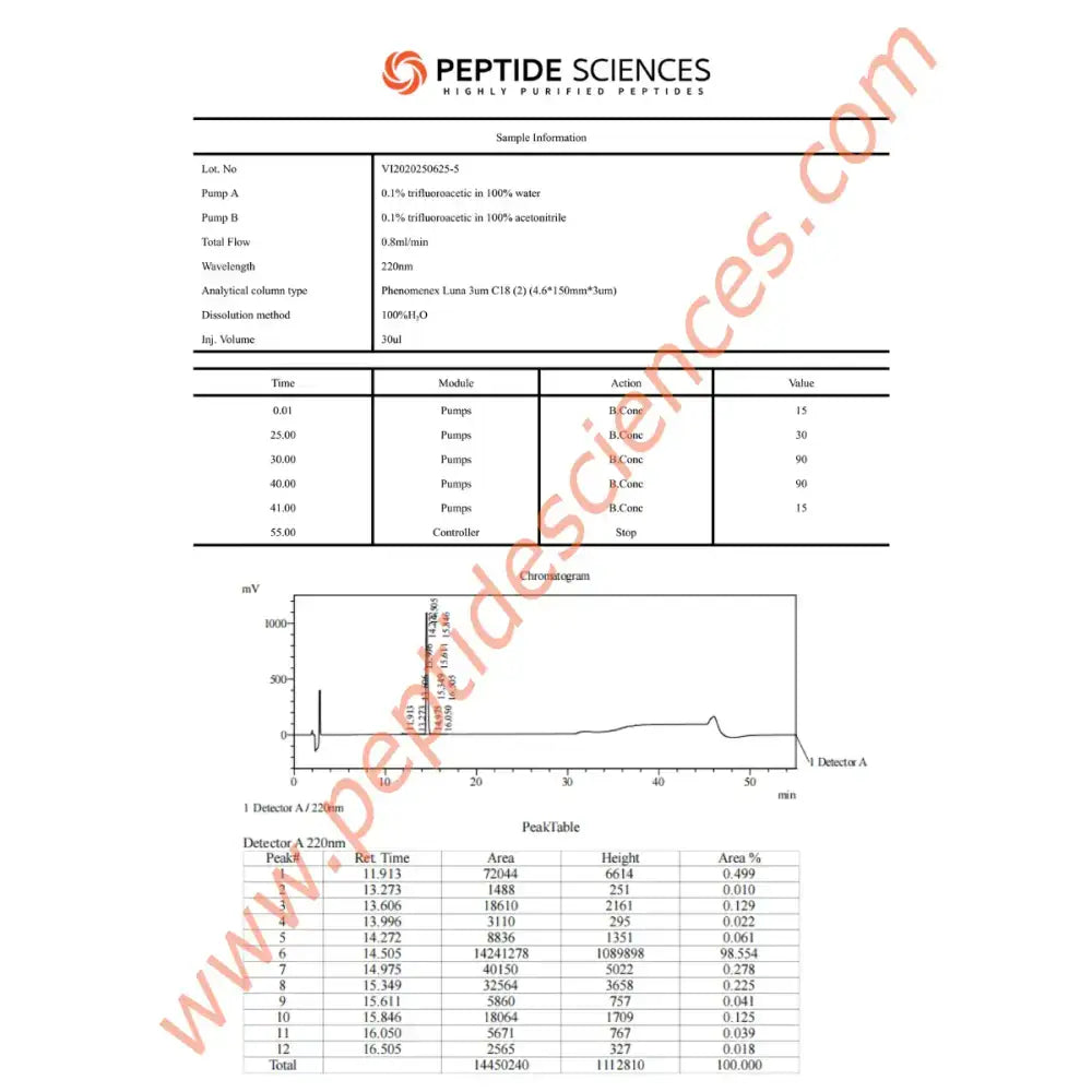 O TB-500 é fornecido como um peptídeo sintético para pesquisa, destinado a fluxos de trabalho laboratoriais controlados. Os pesquisadores geralmente documentam a identidade e a rastreabilidade usando informações de sequência e identificadores de registro (por exemplo, CAS e PubChem CID). A qualificação laboratorial padrão pode incluir avaliação da pureza cromatográfica (por exemplo, métodos baseados em HPLC) e confirmação de massa (por exemplo, métodos baseados em MS) como parte das práticas internas de controle de qualidade.