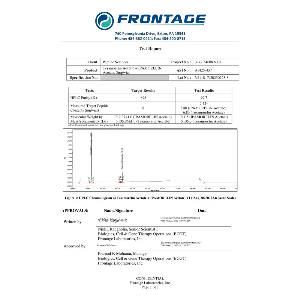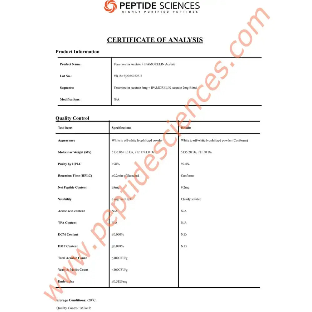 A combinação de ipamorelin e tesamorelin pode potencializar os efeitos, pois cada peptídeo estimula o eixo do hormônio do crescimento por meio de dois mecanismos distintos. Juntos, atuam sinergicamente para estimular a glândula pituitária a produzir e secretar o hormônio do crescimento natural em níveis mais juvenis. Pesquisas demonstraram que o efeito combinado desses dois peptídeos resulta em sono profundo de melhor qualidade, redução dos triglicerídeos, da gordura visceral e da espessura da íntima-média da carótida (cIMT), melhora da cognição e, de modo geral, um melhor funcionamento metabólico.
